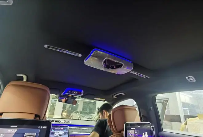 顶棚中间横梁加装了带有大柏林之声高音的手势控制盒,可以通过手势控制电动后门、顶棚天窗、灯光的开关,非常具有科技高级感。