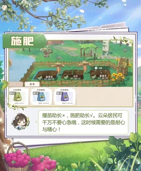 肥料有三种,点击田地即可弹出道具选择框进行拖动施肥,居民们可根据自己的时间合理使用化肥提高种植效率。