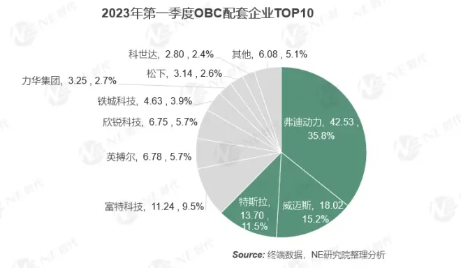 而TOP 5和TOP 10 OBC企业占总装机量的比重仅发生微变。今年第一季度TOP 5市占比77.6%,TOP 10为94.9%。作为对比,2022年第一季度TOP 5和TOP 10市占比分别为76.1%和94.3%。