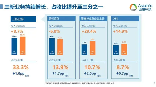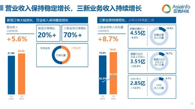 不难发现,无论是业务收入同比上升幅度,还是新签订单同比增长幅度,亚信科技的“三新业务”表现都极为抢眼。这“三新业务”分别指的是数智运营、垂直行业及企业上云、OSS(网络支撑系统),如今三新业务占亚信科技的总体收入比重已经达到了33.3%,较去年同期又有了1个百分点的提升。