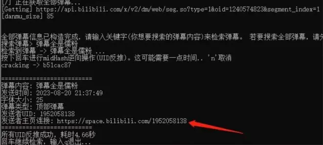我首先查看其发送所有弹幕,然后用反推工具查找该弹幕发送者UID地址。