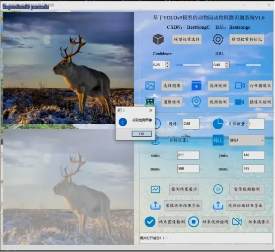 再点击图像检测按钮可完成输入图像的目标检测功能,之后系统会在用时一栏输出检测用时,在目标数量一栏输出已检测到的目标数量,在下拉框可选择已检测目标,对应于目标位置(即xmin、ymin、xmax以及ymax)标签值的改变。