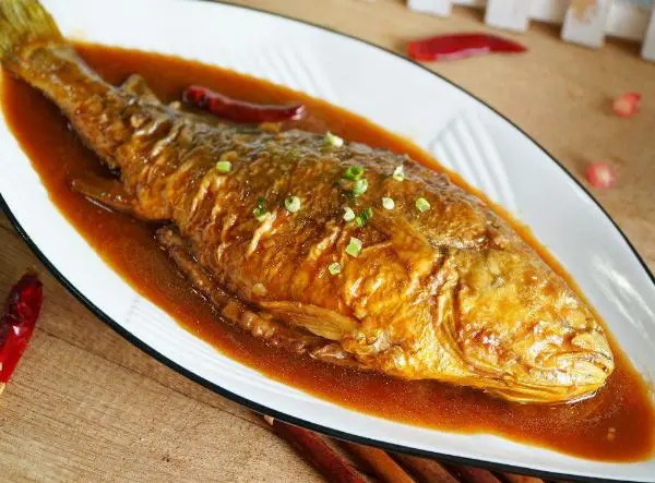 4.烧的时候,不要给鱼翻面,用汤勺将汤汁不停地淋在鱼身上,10分钟后,把葱姜蒜、八角捞出,调少许水淀粉淋入锅中勾芡,用大火收汁后就可以关火盛入盘中了。