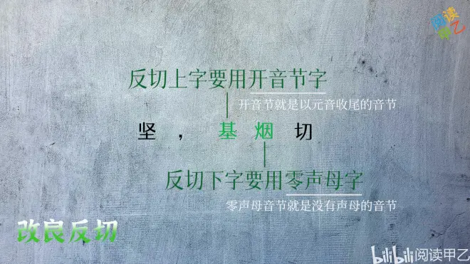 那么这种问题是否可以改善呢?答案是可以的。先来想一下我们现代的拼音,坚,jiān,直接用音素连读就能拼出读音,反切上下字如果也能这样就好了。其实,“坚”的声韵可以用发音近似的汉字“基烟”来表示,“基烟,坚”,两字急读,就能像拼音字母一样合为一音了。