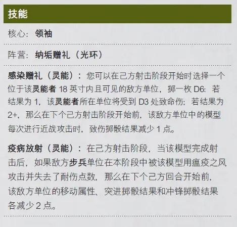 瘟猪是有手雷关键词的,配合使用的话,可以同时打出12d6,4+一点致命伤,还是能当作一个小爆发的。另一个技能也是十分不错的,首先是给领导的单位武器“附魔”,其实也就是给猪的远程武器打上致命一击的词条,重点是后半段,使得5+即可触发自动造伤,这使得不论是近战或是远程攻击时,在面对高T单位,都能提高不少的输出。顺带一提,手雷哥的自爆得到了保留,虽然伤害不高,但别忘了抛爆不爆炸。