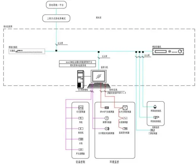 配电室综合监控系统包括智能监控系统屏、通讯管理机、UPS电源、视频监控子系统(云台球机、枪机)、环境监测子系统(温度、湿度、水浸、烟感)、控制子系统(灯光、空调、除湿机、风机、水泵)、门禁监控子系统(读卡器、开门按钮、磁力锁)、安防监控子系统(双鉴检测器)。