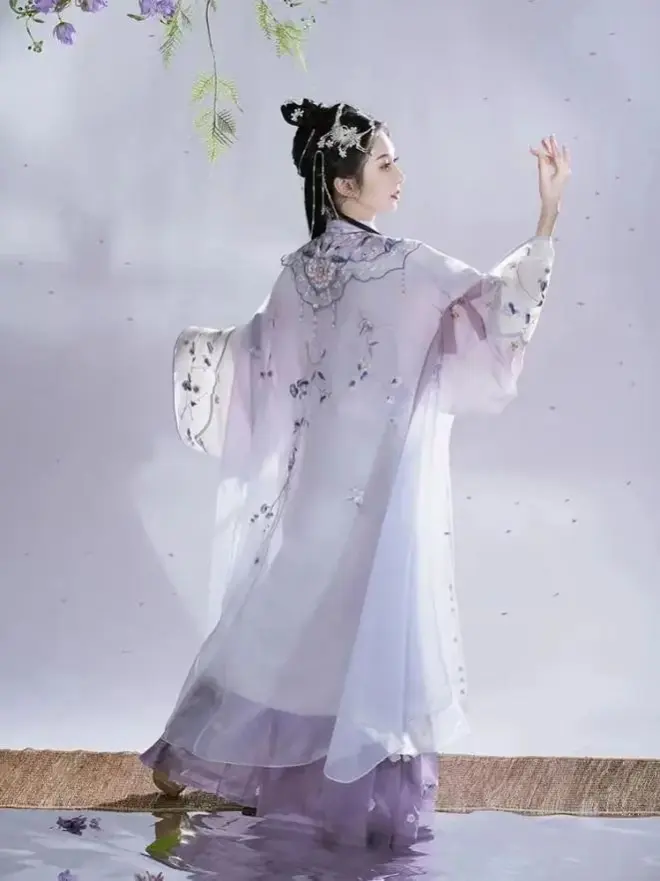 “莫愁粉黛临窗懒,梁广丹青点笔迟。”粉紫色上衣有着少女的温柔与明亮,衣身上的刺绣牡丹与蝴蝶灵动,纱制马面裙上的牡丹娇艳仿佛沾满清香,辞夏秋长,月留余芳。