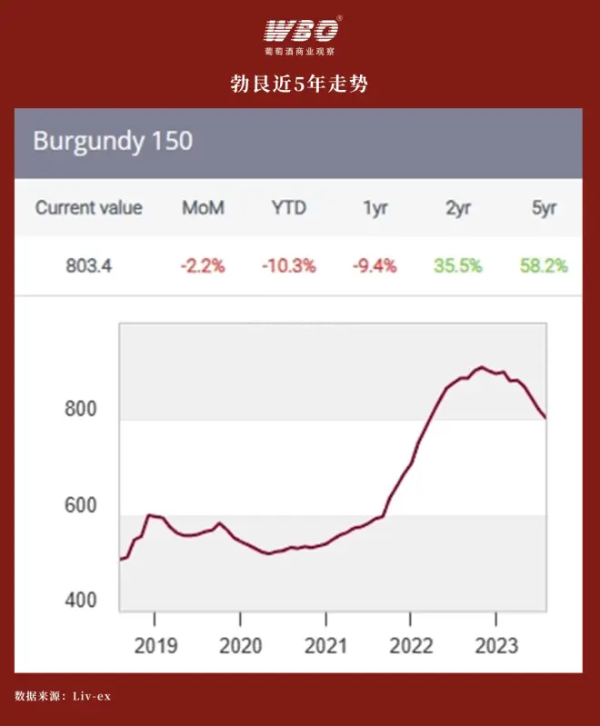 从该指数可以看到,勃艮第150指数自2022年10月达到顶峰之后,便一直持续呈现下跌的趋势,并在今年上半年整体跌幅达到了8.3%,以至于作为交易平台方的Liv-ex董事长兼首席执行官詹姆斯·迈尔斯也主动强调了这一现象应该修正,并暗示勃艮第之前的价格过于高企。