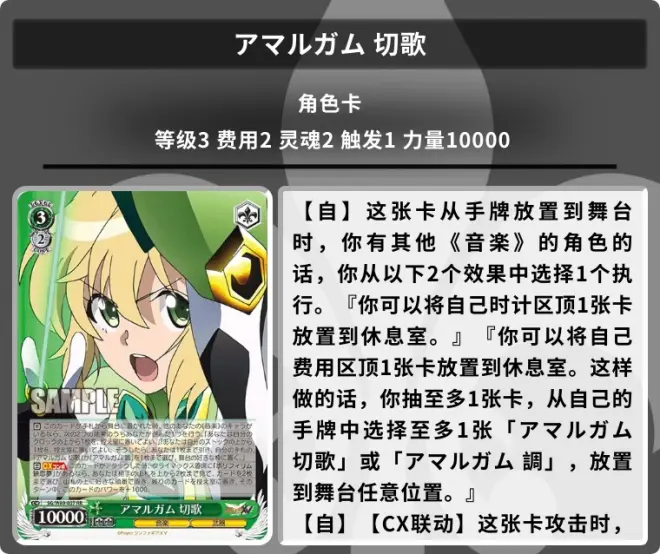 曾被誉为在ws里面打ygo的系列,在2级通过特定下级检索特定变身事件,之后通过事件登场复数アマルガム 切歌或者アマルガム 調。登场cost较低且能够补回一定资源,并实现2级强大的早出压场,加上两者均自带联动,打出联动的情况下可以给予对手较大的血线压力。而对手则要兼顾压缩和解场,一旦处理的不够好很容易就此被奠定胜负。