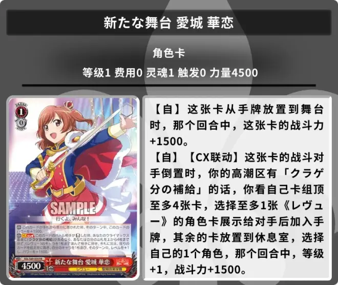 二级和三级为同潮联动再会 愛城 華恋和次の舞台、次の役へ 愛城 華恋,前者联动可以精堆控室1费,看顶概率补手。后者则是联动二择,看三张选择任意卡送控,之后洗牌或者烧2。三级联动具有一定的灵活性,根据对手的血线和卡组状况进行选择,高潮虽是门潮但是有专属事件可以回收,也使得牌手可以2级放心开联动。