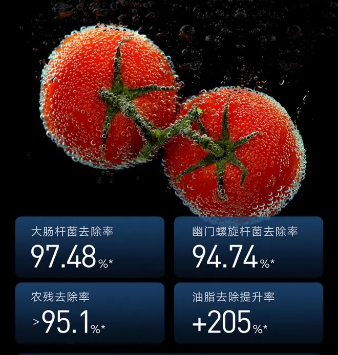 超微气泡水,顾名思义指的就是含有大量超微小体积气泡的水,而这种气泡水由小至微纳米级的水分子所组成,能够很容易深入到食材表面,去除附着在其中的细菌、油污,并带走难以去除的残留农药,能够从真正意义上将果蔬清洗得非常干净。
