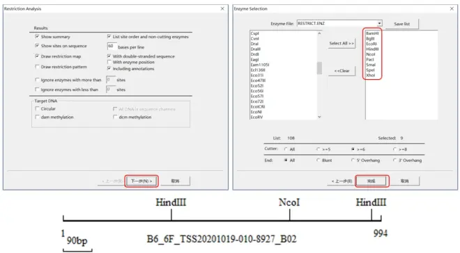 加载序列后,单击菜单→【Restriction】→【Restriction Analysis】,选择需要分析的酶切位点,点击【完成】即可。分析结果会给出序列上酶切位点的具体位置,也会给出相应的示意图。