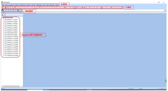 主菜单:文件,编辑,查找,酶切位点,引物等;工具栏:新建,打开,打印,复制,粘贴等;浏览器栏:界面显示,前进,后退等。最左侧的则是Channels工具条,用于存放DNA或蛋白序列,DNAMAN中提供20个Channels,也就是一次性能导入20条序列。