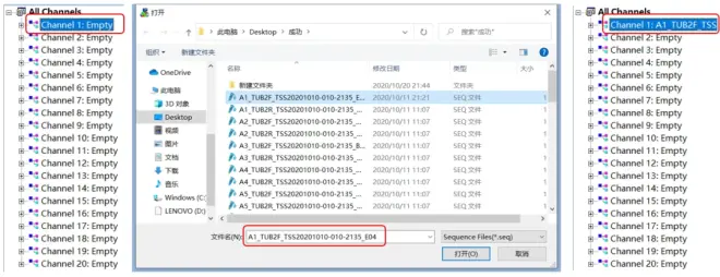 先选中某个Channel,单击菜单→【Sequence】→【Load Sequence】→【From Sequence File】选中相应的序列文件即可导入序列。