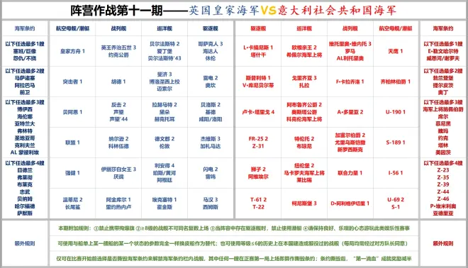 -双方阵营分别为英国皇家海军和意大利社会共和国海军,规模为12v12,玩家可以自由选择加入哪一方阵营(直到满人)。选择阵营的先后顺序以报名的顺序进行排队预定。