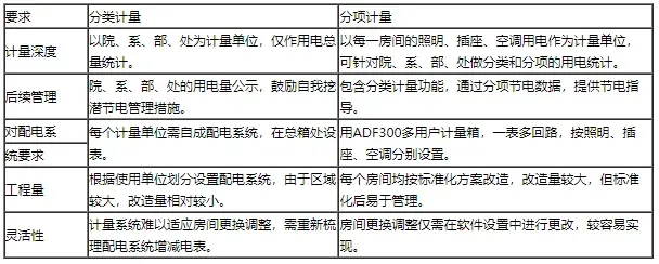 通过图表列出分类和分项的对比资料可见,两种方式都可以满足本次改造的目的,只是分项比分类得到的能耗数据更多,计量精细化程度更高,对后期改造适应性也更好,但改造工程量大,需求经费多。