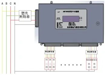 末端电子表计量设置: 办公室、实验室、教学实验教室,按房间数量设置ADF300多用户计量箱。ADF300系列多用户计量箱是一种电子式智能化多用户电能表,设计采用一户一计量方案,具有计量准确度高、户与户之间计量互不干扰、集中安装、集中管理优势。最大可以同时计量12户三相、36户单相、单/三相回路混合用电状况,其接线示意图如下图所示。