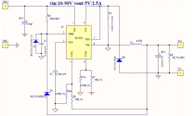 SL3036 是一款支持宽电压输入的开关降压型DC-DC,芯片内置100V/5A功率MOS,最高输入电压90V。SL3036具有低待机功耗、高效率、低纹波、优异的母线电压调整率和负载调整率等特性。支持大电流输出,输出电流可达2A 以上。