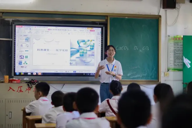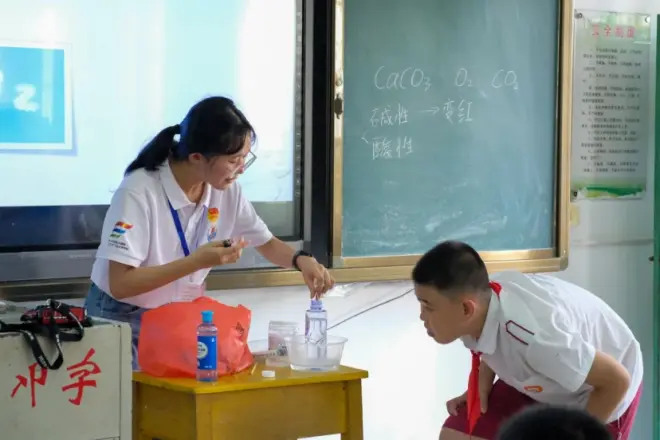 理论与实践并肩而行,好奇心助力点燃课堂。支教老师吴美茵将理论与实践相结合,围绕化学物质“小苏打”展开课堂,亲自动手展示化学实验,激发学生浓厚的好奇心。“来,同学们请看向我,我要开始做化学实验了!”吴美茵运用酚酞遇到碱性物质会变红的化学知识,将酚酞试液滴入小苏打水中,液体由无色变红。就像是一位魔术师,吴美茵变换着“化学的魔法”。“今天我最喜欢的就是化学课了,我觉得化学实验非常好玩!”学生高琳琳经过一天的学习对我们的问题作出回答,她表示对初中化学课程的学习更加感兴趣。“整节课下来我发现同学们的参与度很高,很多问题在老师的引导下他们都能作出正确回答。”吴美茵对课堂非常满意,她认为本次支教为其今后的职业导向提供思路和经验,未来她会不断提升自己的专业技能,争取在教育行业走出自己的道路。