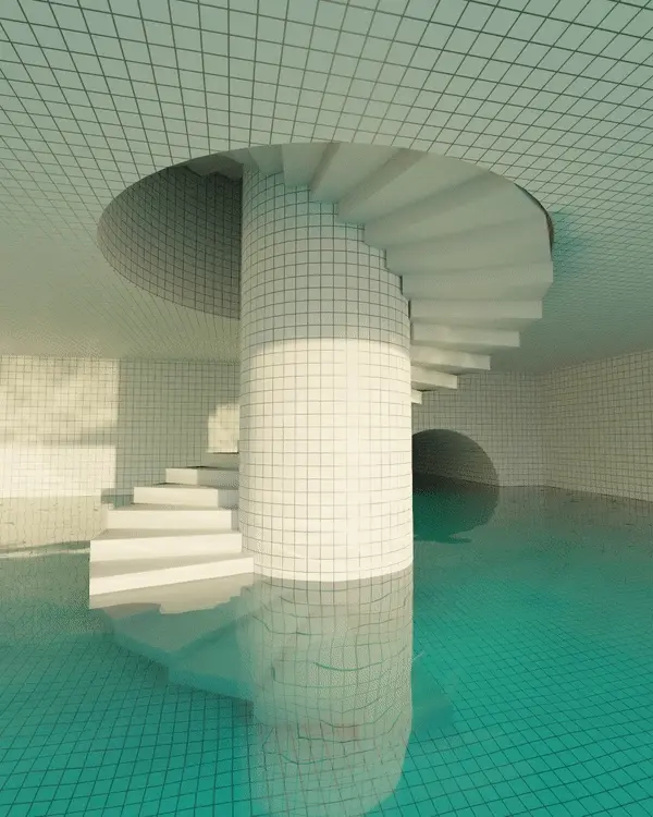 在无数次的勘探,去过众多无边无际的地方之后,我似乎来到了一个可以独处的地方:无边的厅室,长长的,明暗分明的走廊过道,无尽的空旷,我早习以为常。然而,这里是我在混沌与迷茫风暴之后的第一个休息地 — 是我最终平和休息的地方。在这之前,我从未见过这样的建筑结构,敞亮的房间,充满蓝色的水的泳池如同温暖的臂膀一样拥抱着你,洁白的瓷砖组成了墙壁和地板,光线四漫,每个角落皆被这璀璨的光芒照耀着。