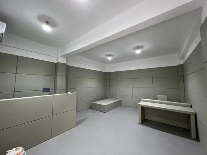 禁闭室常用软包有玻璃棉软包、纳米棉软包,其防撞、阻燃、环保、吸音效果完全符合国家相关部门的检测。安装简单、安全、易保养好管理使用寿命长。