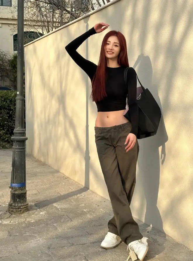 这是周洁琼正面拍摄的黑色服饰写真。只见她身穿黑色长袖露脐上衣,下身穿着褐色的休闲长裤,裤子宽松,有点滑落到盘骨了;她脚穿白色运动鞋,背着黑色购物袋,长发披肩,一副潮人的打扮。