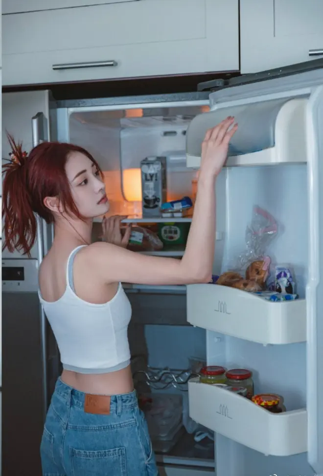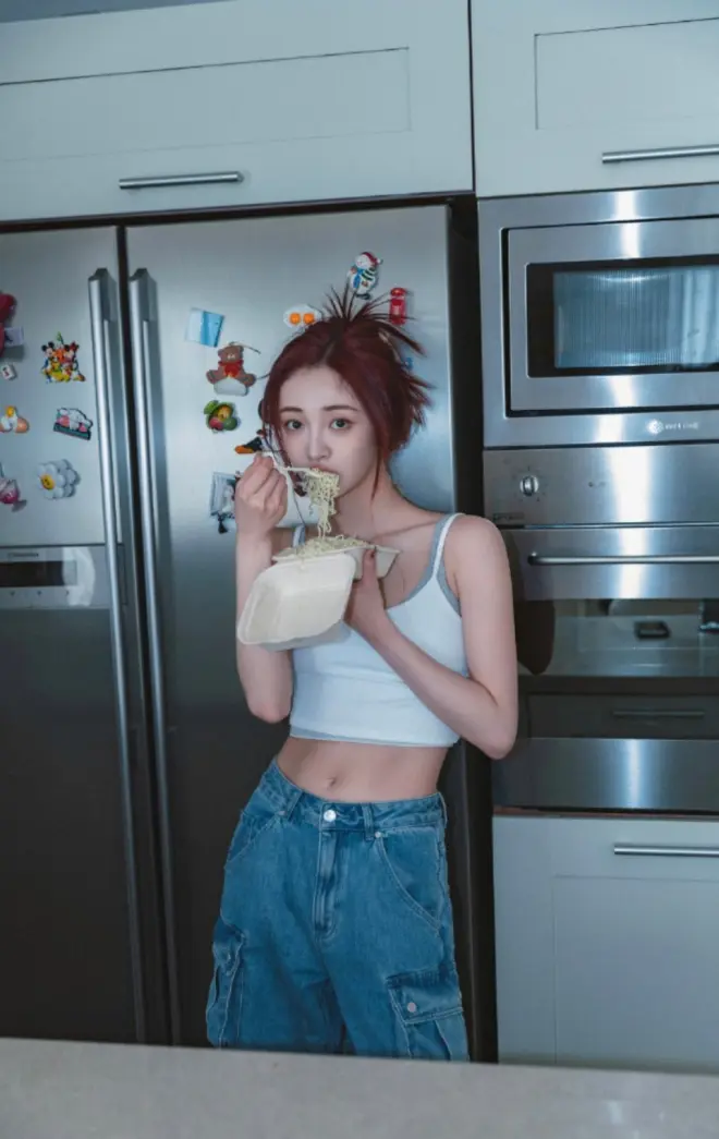 这些是周洁琼白色背心牛仔裤的生活写真。我们看到她在家里打着电话,吃着干面;从她的背面看到她的小蛮腰,而前面看到她的小腹肌,纯属邻家女孩的打扮。