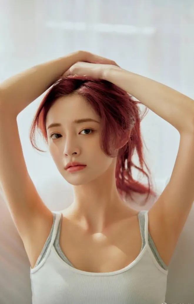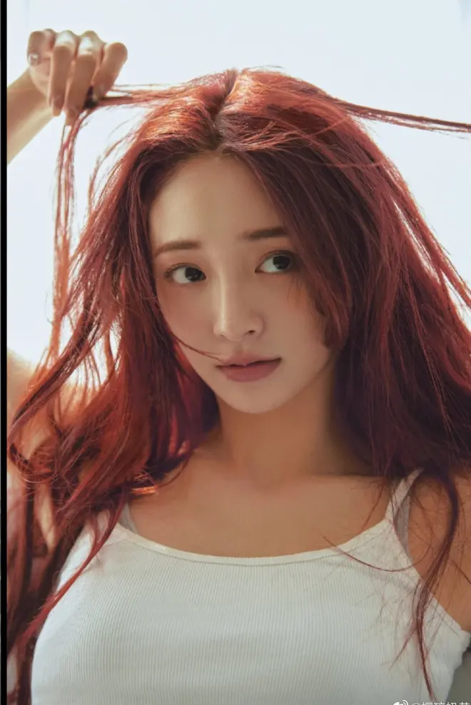 这是周洁琼白色背心的写真。只见她头发披散,而且染了偏红色,内穿灰色胸衣,外面穿着白色背心,防护意识很强啊;而她下身穿着牛仔裤,坐在沙发上拨弄自己的红发。她整体打扮很轻松舒适,颇具少女感的打扮凸显了娇艳可人的气质。