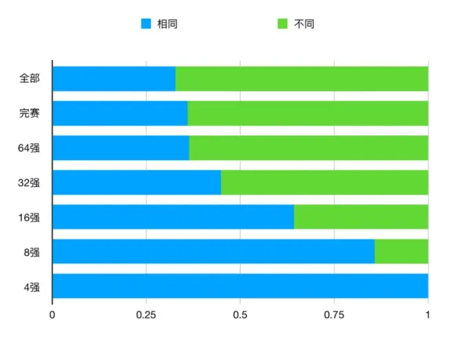 可以看出,选择了自身队伍所对应世代的训练家比例随着比赛进程的推进不断上升,而四强选手全部选择了与自己队伍相对应的答案。
