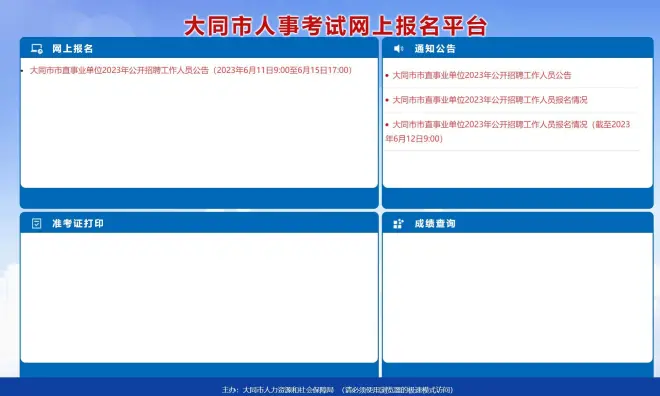本次公开招聘采取网上报名方式。报名入口为:大同市人民政府门户网站—办事服务—便民服务—人事考试。报名入口界面如下图所示: