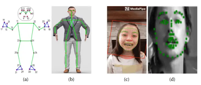 HPE 中的标准是指用于进行估计的地标的数量,这意味着需要定位的人体关节或预定义地标的数量。 这个数字因所进行的姿势估计类型和方法本身而异。 表 4.1 列出了身体、面部和手部姿势估计的几种方法,以及它们使用的相应地标数量。 请参阅图 4.1 以获取相同类型的姿势估计示例,这些示例在使用的地标数量上有所不同。