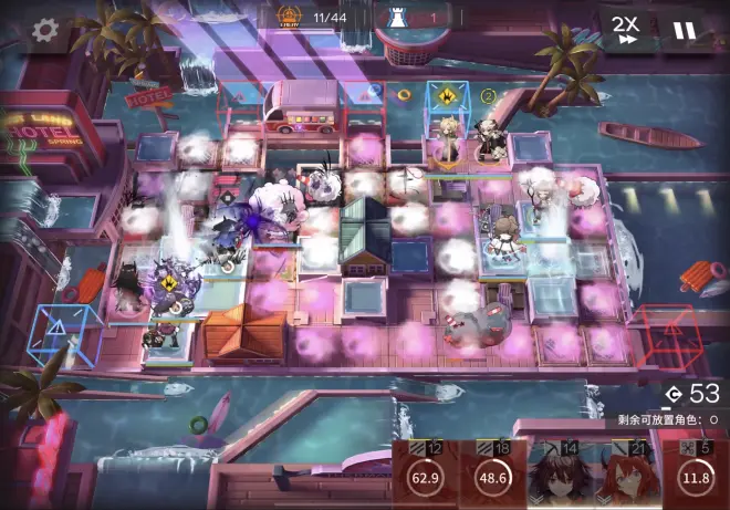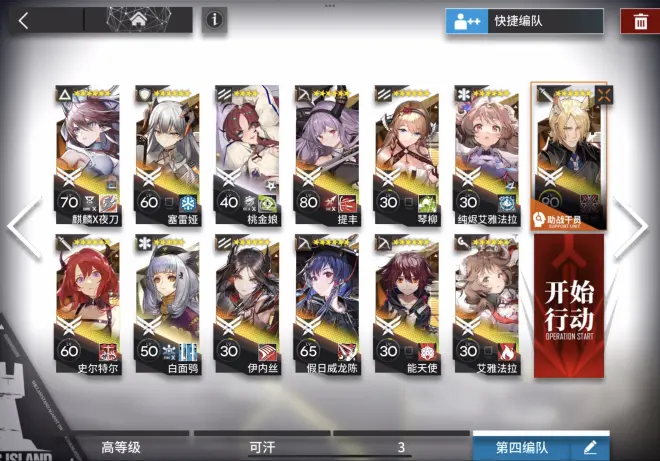 没有澄闪和凯尔稀,替换的干员练度也不高:右边用小羊(2301)换澄闪,左边用提丰(2803)+水陈(2653)+白面鸮(2501),压力大时放个伊内丝(2303)捆住。