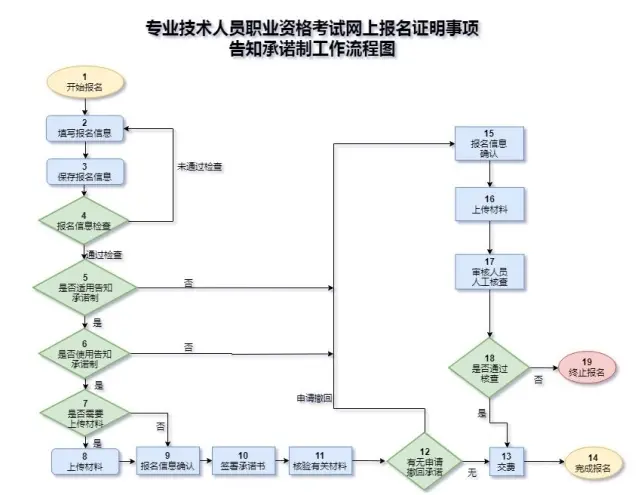 上图为专业技术人员职业资格考试网上报名注意事项告知承诺工作流程图。
