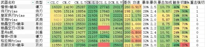 改动后全武器输出强度计算可前往afdian.net/album/eea01b1ab58811ecba6f52540025c377下载最新版本文档,在表6查看。示例数据如下: