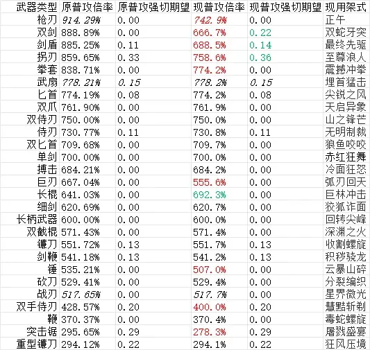 只考虑架式倍率时,为各类武器选择倍率最高的架式,相关数据如下:
