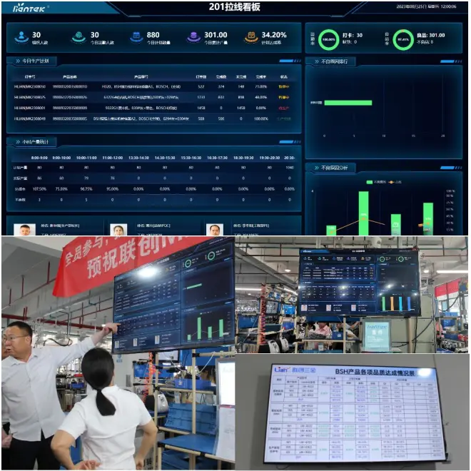 另外,联创三金产线前的电子看板显示了各种生产数据,包括生产计划、产量、质量指标等。这些数据通过直观的图表和图形呈现,使得生产过程更加清晰可见。这种可视化呈现帮助管理人员和工作人员实时获取信息,有助于协调各个部门之间的工作,确保生产计划的顺利执行,做出准确决策。