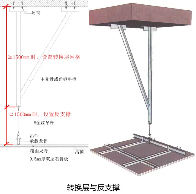 2、当吊顶内部空间大于3.0m时,(或反支撑垂直长度>1500时)应该设置转换层;