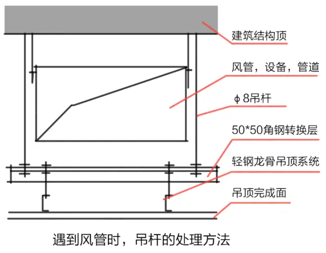 PS:当吊杆与设备相遇时应调整并增设吊杆,吊顶面积较大时,吊顶设备排布复杂不建议使用反支撑。