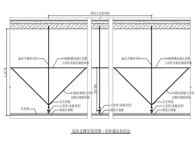 做法要求:斜拉钢筋每隔两倍主龙骨间距设置。∅8横向钢筋、斜拉钢筋及其与M8全牙吊杆焊接处必须做防锈处理。∅8钢筋可用M8全牙吊杆替代,但焊接处需做防锈处理。