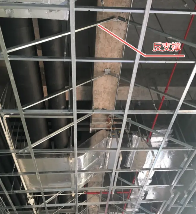 反支撑是指为了防止吊杆过长导致吊顶不稳摆动的现象,通过角钢把吊顶龙骨“按”在原地,形成垂直对抗气压的力的建筑构件形式。