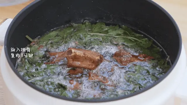 4. 油锅放入薄荷叶,待薄荷叶变软炸出香味(薄荷不捞出),再次放入排骨复炸1分钟即可出锅啦。