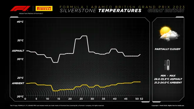 但是这场比赛轮胎表现到底有些特殊——比如拉塞尔红胎在重油stint跑了28圈,但是汉密尔顿在比赛最后尝试红胎攻白胎的诺里斯时轻油红胎巅峰性能没撑过5圈,总体来看速度优于诺里斯的圈数也没多于10圈,这是一个在我看来不太好解释的情况,倍耐力在赛后的轮胎总结报告当中也没有提到这一点。我个人能够提出的一个想法是可能是温度导致的红胎性能差异——虽然在整场比赛中赛道温度的波动不超过10度。