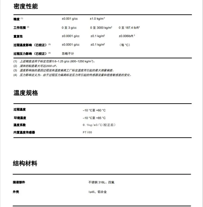 • 连续测量 • 没有可动部件,维护量少 • 提供包括316L、四氟等材质 • 密度、标准密度或特殊计算值 (固体百分比、 °API、比重等)、4–20 mA输出。 • 提供温度传感器 液体密度计 含气 最大液体粘度 一般不使用 2000 cP • 接液材质