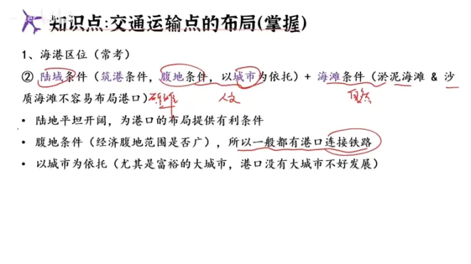 ✓海港区位(常考):既要考虑海洋又要考虑陆地!港口建在凹岸!侵蚀岸(不怕侵蚀,就怕堆积!)