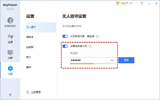 除了可以使用登录同一账号这种方式控制无人值守的电脑,您还可以在被控端设置安全码,在远程连接时输入安全码执行无人值守的远程访问。