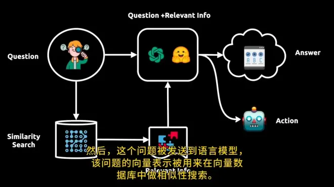 用户问问题,问题发送到LLM,向量数据库做相似性检索,获得chunk,反馈给LLM,采取行动