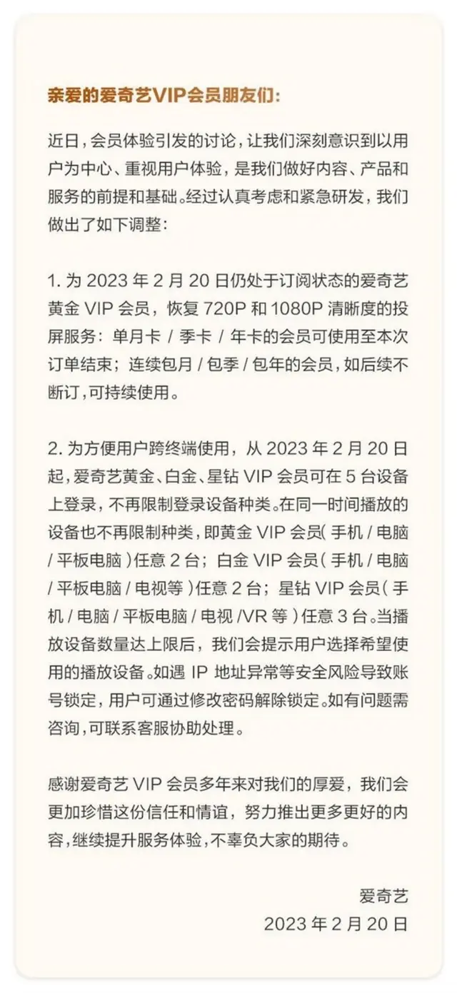“投屏风波”后,爱奇艺也发出了“认错”声明,不过也有网友发现,虽然限制投屏问题有所改变,但针对的仅是黄金及以上会员,且会员订单到期后,再订阅也无法高清投屏。