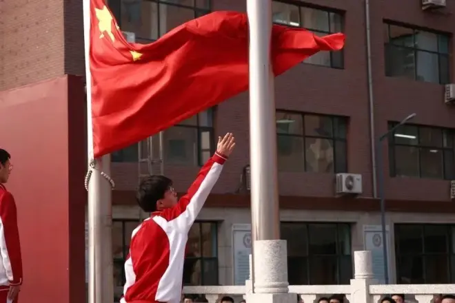 在雄壮的国歌声中,鲜艳的五星红旗冉冉升起。师生齐唱国歌,行注目礼。