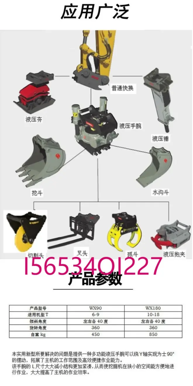 用于挖掘机多角度或狭小空间作业。可360度旋转,可左右摇摆40度,并且具有抱夹,