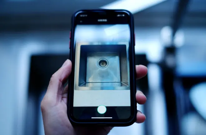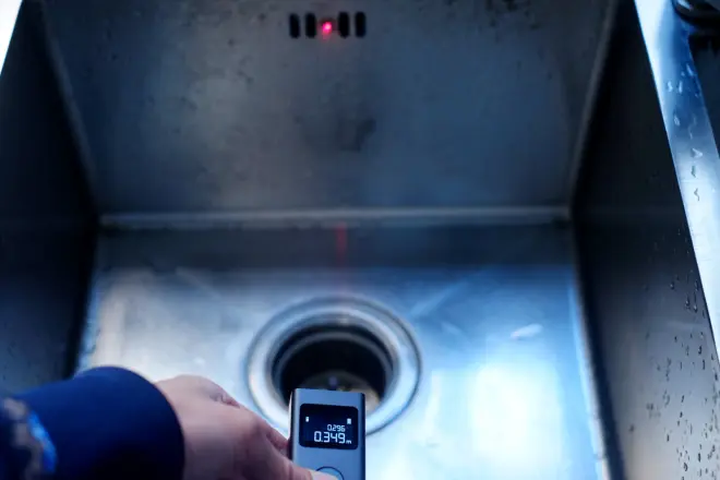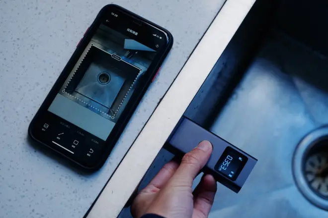 刚好家中厨房的洗手池要买一个沥水篮,我们便用它来测量下洗手池的宽度。将测距仪底部与洗手池侧面贴合对齐,短按测距仪便可以开始测量。